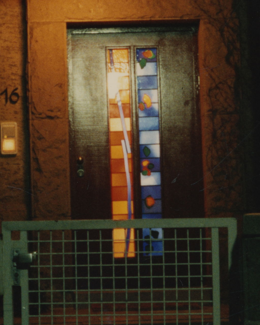 The Bieling Window was created by Brian Clarke in 1993 for the entrance door of the private residence of Thomas Bieling, son of the founder of the architectural firm Bieling & Bieling and director of the firm since 2011. The work consists of two narrow glass panels in red and blue tones, incorporating both amorphs and linear elements.