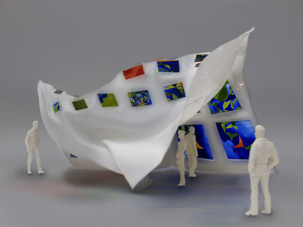 Clarke’s project was conceived as an arched architectural structure measuring approximately 4 meters in height, 6 meters in length and 3.5 meters in width. It was planned to be constructed from steel-reinforced composite and to incorporate a series of square stained glass panels featuring amorphs in blue, green, yellow and red.