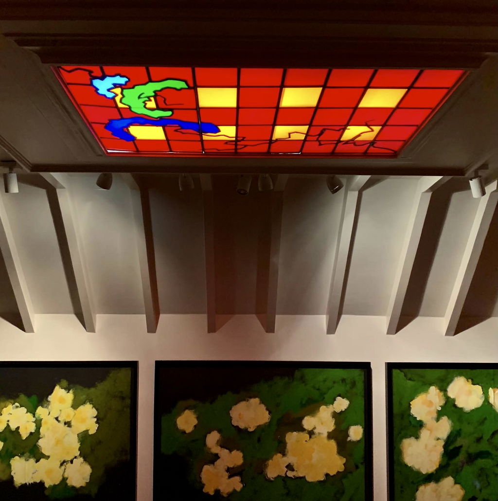 This stained glass window was created in 1989 by Brian Clarke for the dining room of Peel Cottage. It consists of a single panel featuring a grid motif in red and yellow, incorporating blue and green amorphs and free-flowing lead lines.