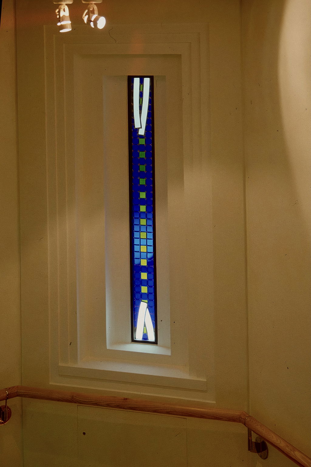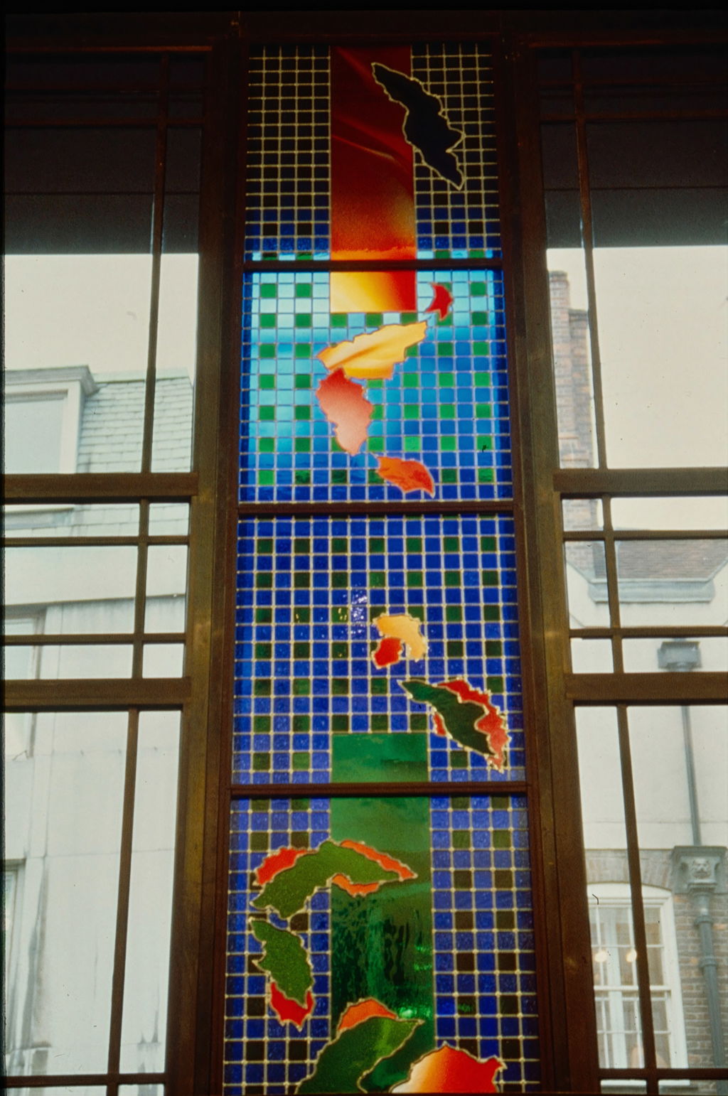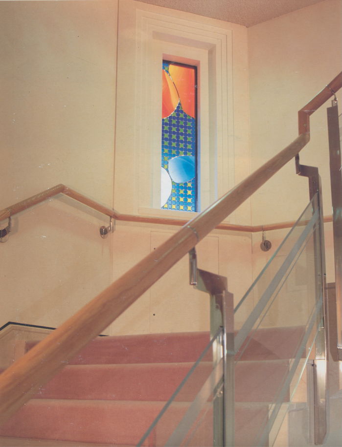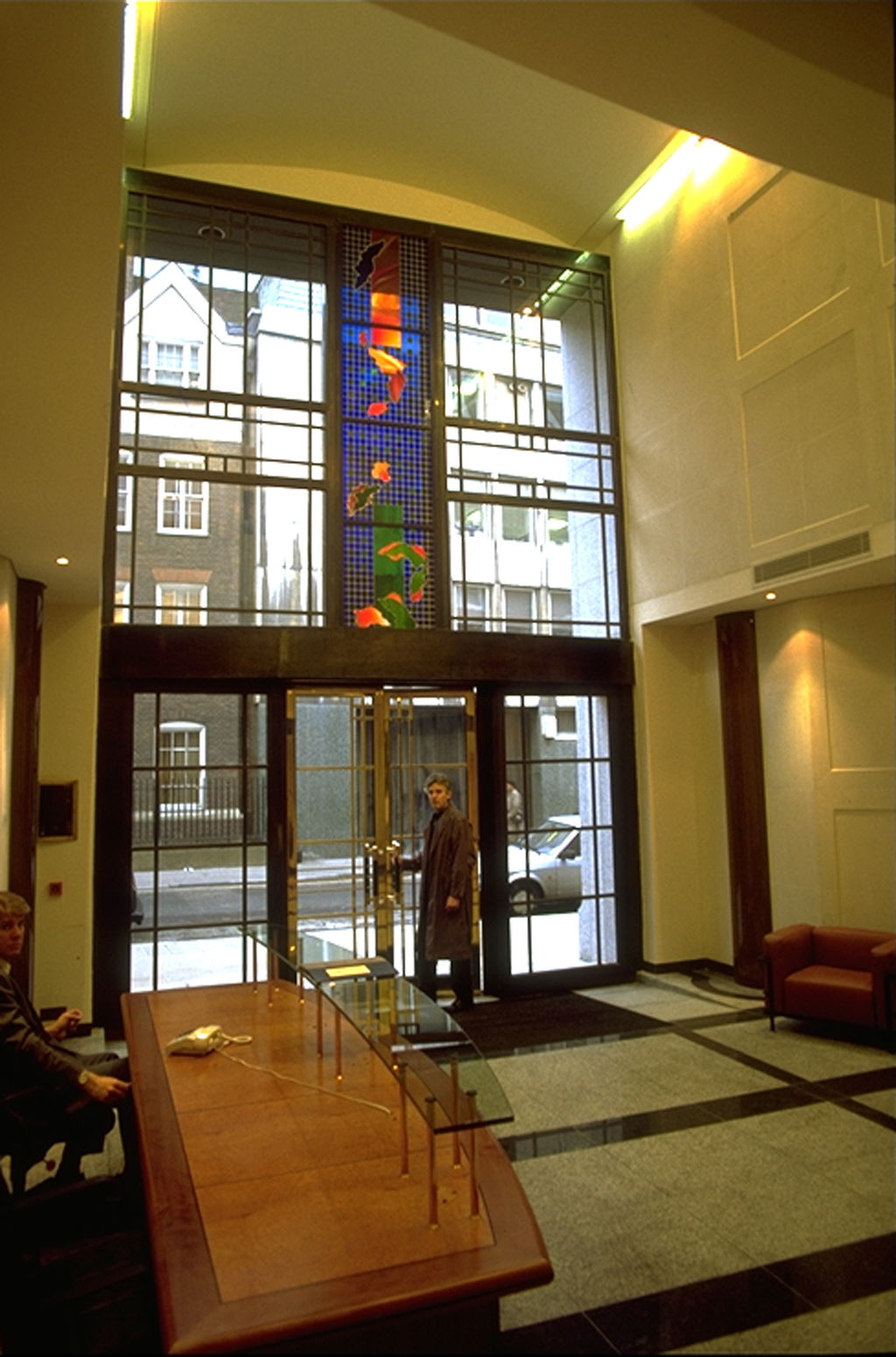 In 1991, Brian Clarke created a series of stained glass windows for Halsbury House, located at 35 Chancery Lane in London. Clarke’s work included a large stained glass panel featuring amorphs on a grid background above the entrance door, as well as narrow windows in the main staircase and a rear screen wall to the first floor.