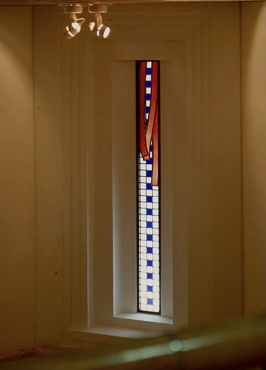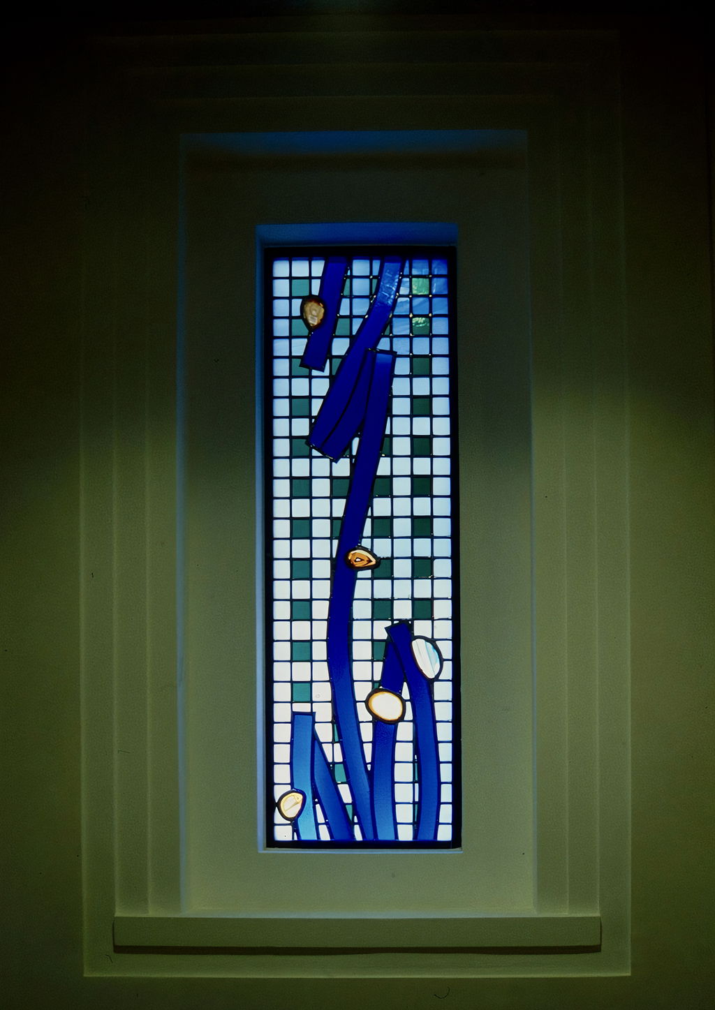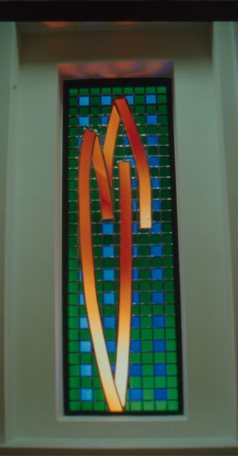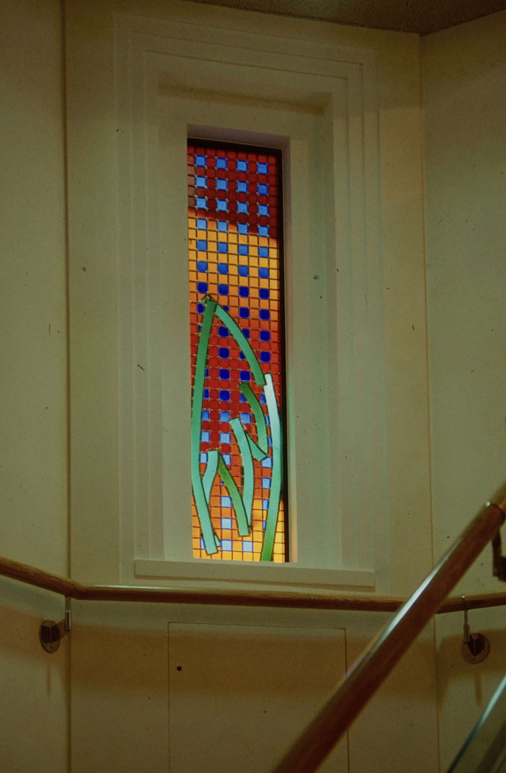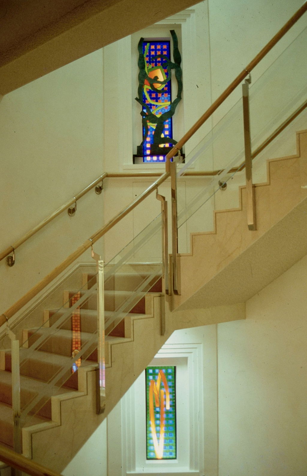 In 1991, Brian Clarke created a series of stained glass windows for Halsbury House, located at 35 Chancery Lane in London. Clarke’s work included a large stained glass panel featuring amorphs on a grid background above the entrance door, as well as narrow windows in the main staircase and a rear screen wall to the first floor.