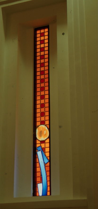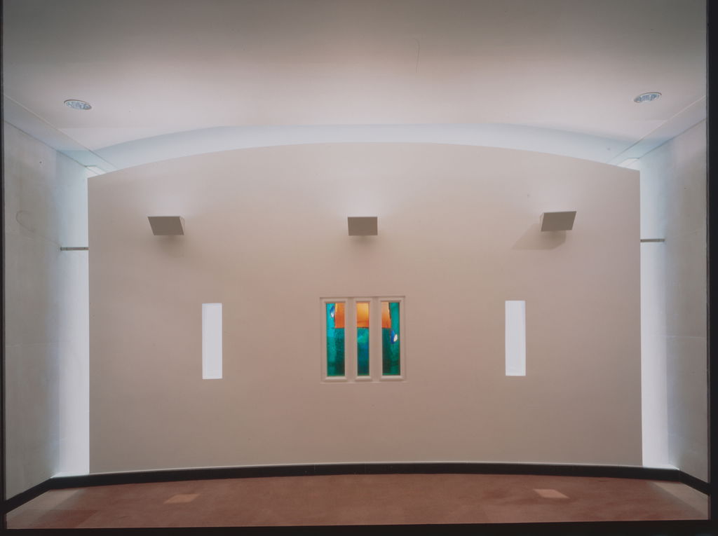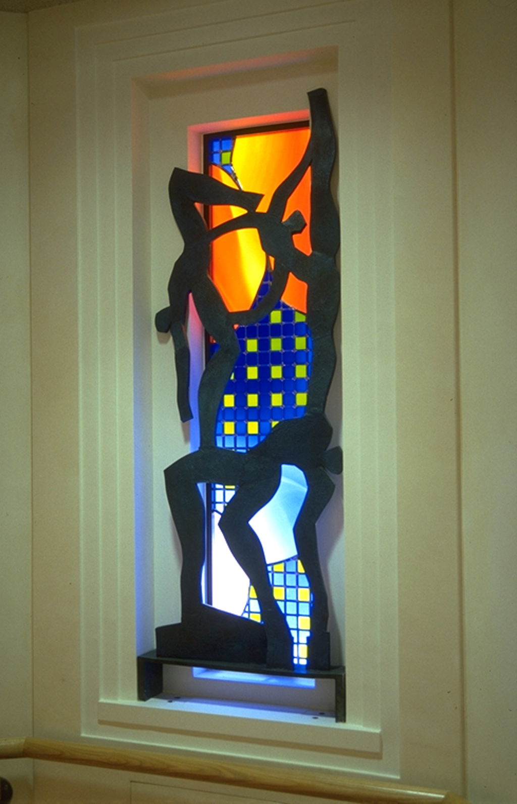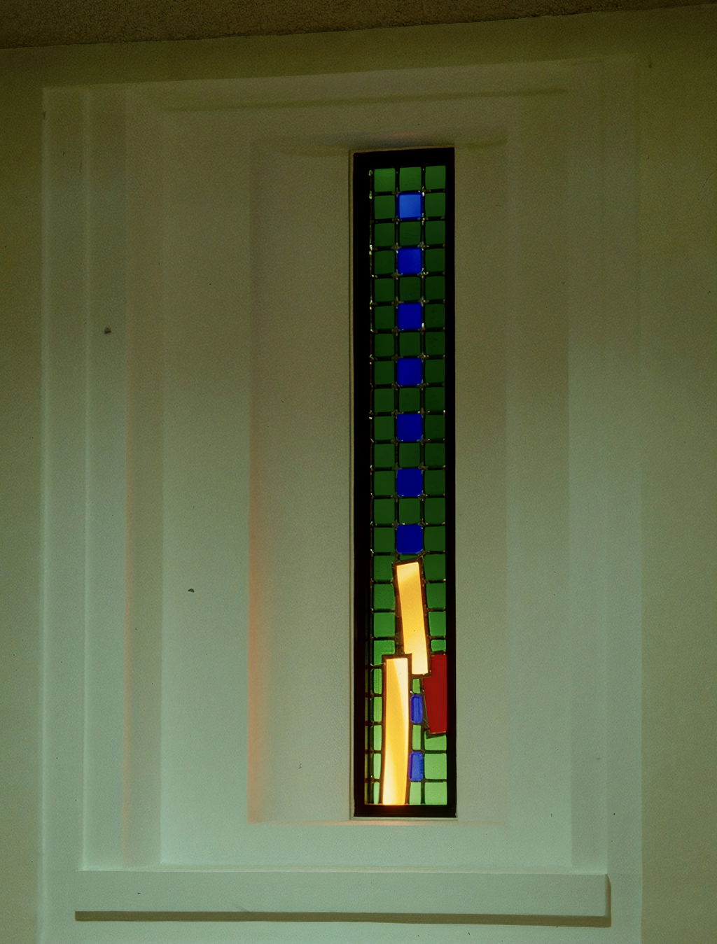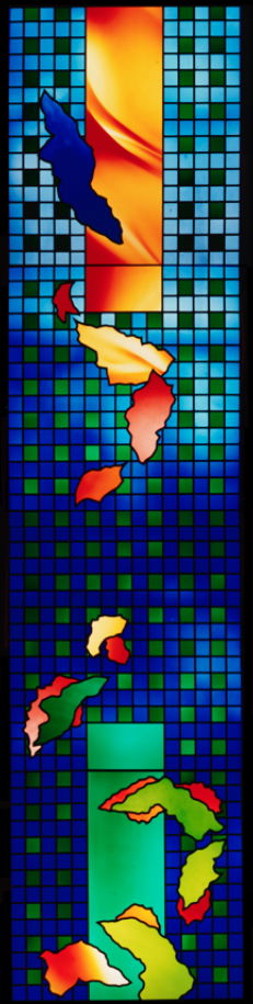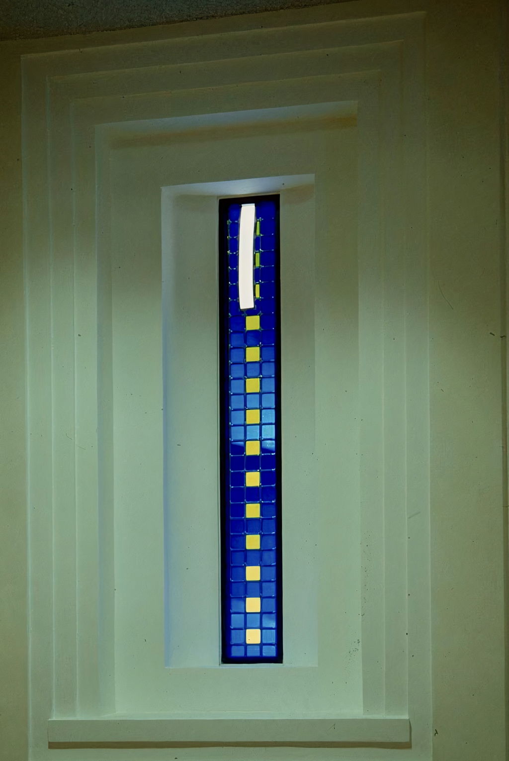 In 1991, Brian Clarke created a series of stained glass windows for Halsbury House, located at 35 Chancery Lane in London. Clarke’s work included a large stained glass panel featuring amorphs on a grid background above the entrance door, as well as narrow windows in the main staircase and a rear screen wall to the first floor.