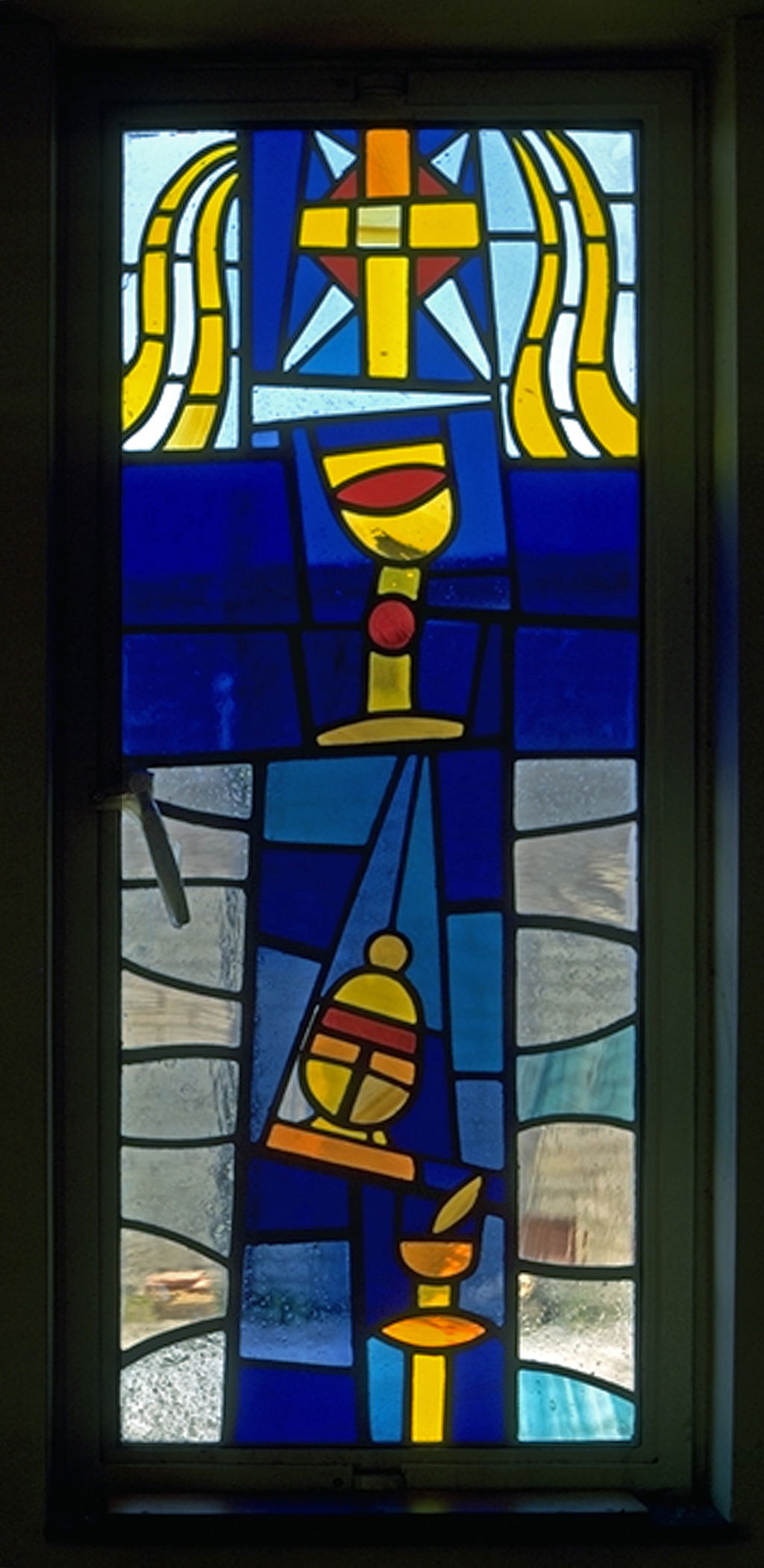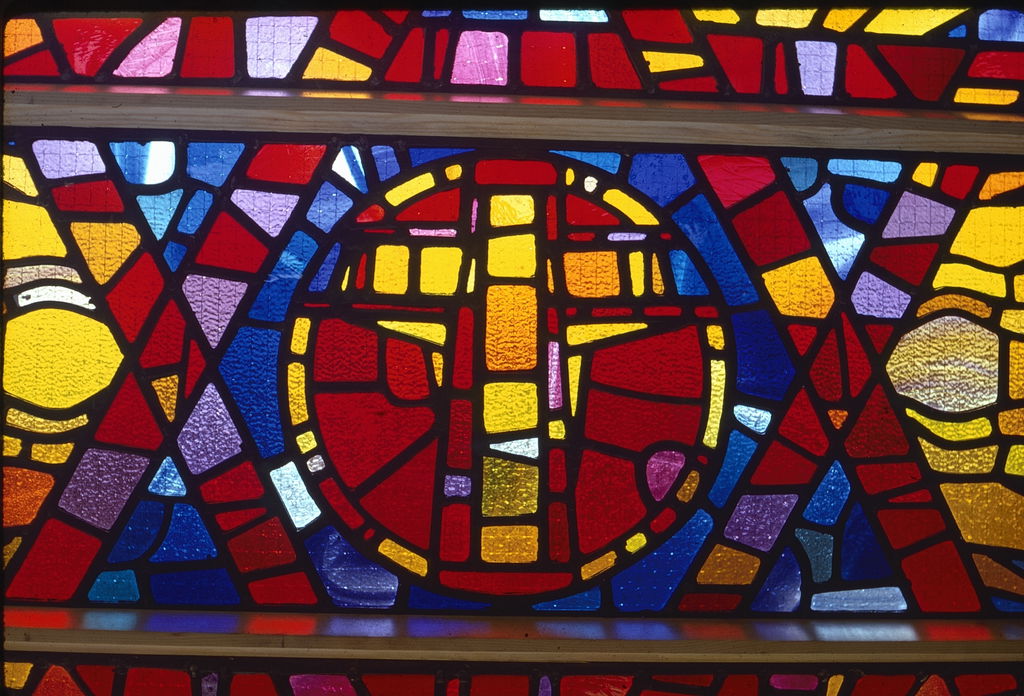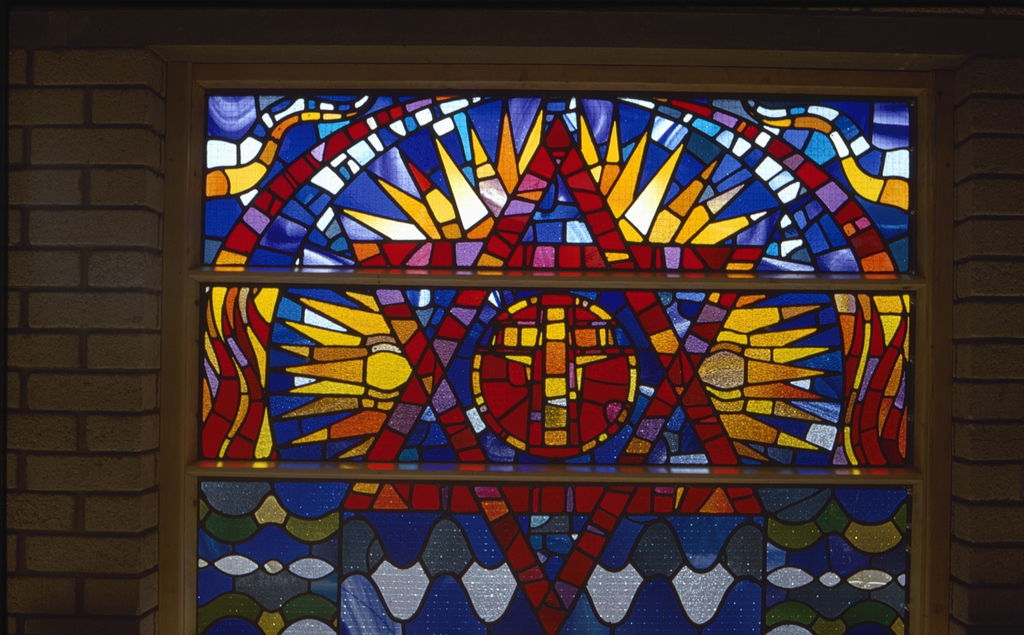 Clarke’s project includes colourful square nave windows incorporating religious symbolism, along with two slim horizontal clerestory windows presenting the Alpha and Omega against blue-green and yellow-red backgrounds, respectively. A further narrow vertical window depicts stylised liturgical objects such as a chalice, a candle and a cross.