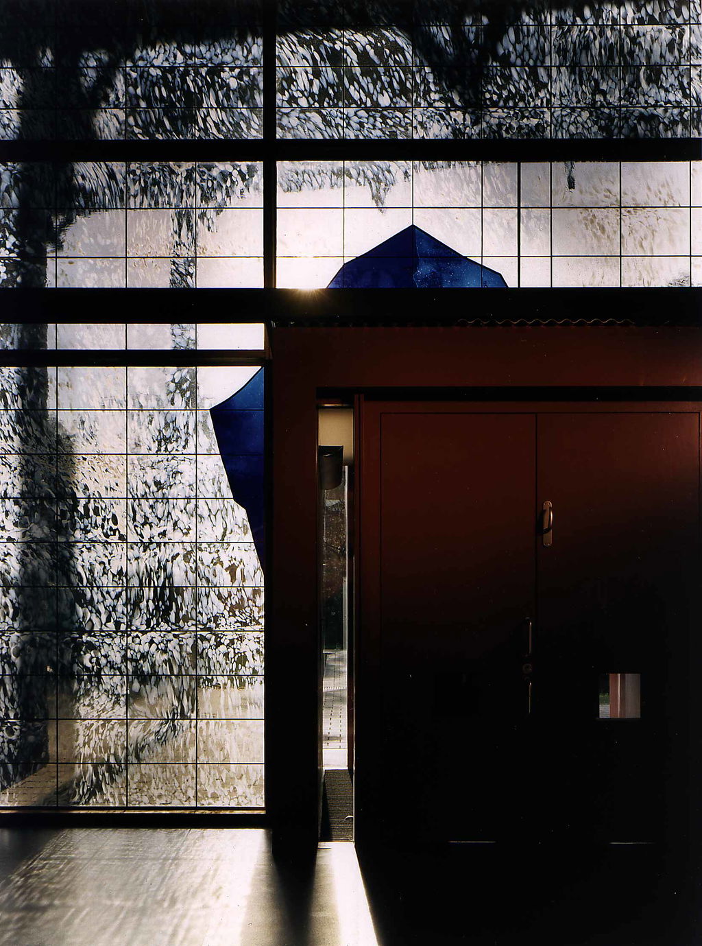 In 1996, Brian Clarke was commissioned to design the glass entrance of a kinderhaus in Regensburg. He created a glass façade that spans from floor to ceiling and features transparent glass panels punctuated with white passages, which Clarke termed ‘Milchwasser Glass.’ Above the entrance, a blue irregular element completes the design.