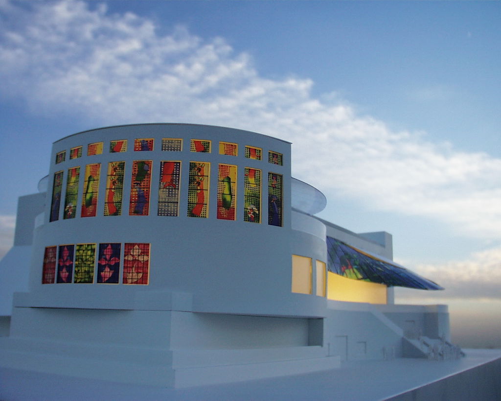 In 1998, Brian Clarke worked on a commission for a glass roof, windows and water sculptures for the Neiman Marcus and Fashion Show Mall in Las Vegas, Nevada. Although the project was not realised on site, it survives as an architectural model integrating stained glass windows with Fleur-de-Lys, amorph and grid motifs, accompanied by related designs on paper.