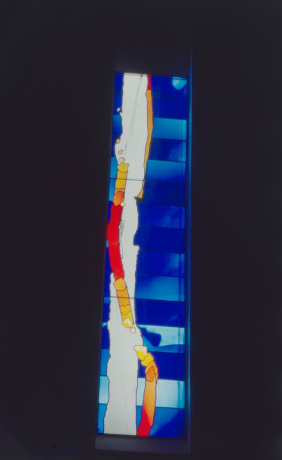 In 1993, Brian Clarke created this stained glass roof window for a private residence in Nuremberg, Germany. The slim, rectangular window features flowing linear elements in shades of yellow and red against a white and blue background.