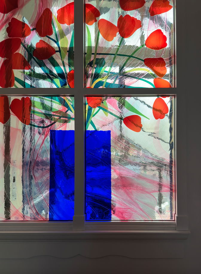 In 2025, Brian Clarke was commissioned to design stained glass for an internal secondary front door in a private London residence. The upper section of the door features transparent glass panels depicting a blue vase filled with red tulips, a motif that continues into the transom window above.