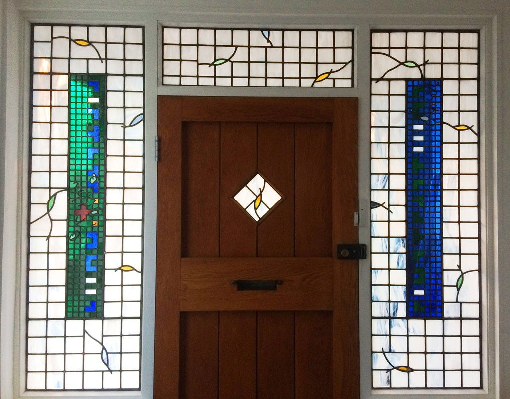 In 1984, Brian Clarke designed two slim side windows for the entrance of a private London residence. They feature grid motifs on green and white grounds respectively, combining computergram elements with free, calligraphic lead lines.