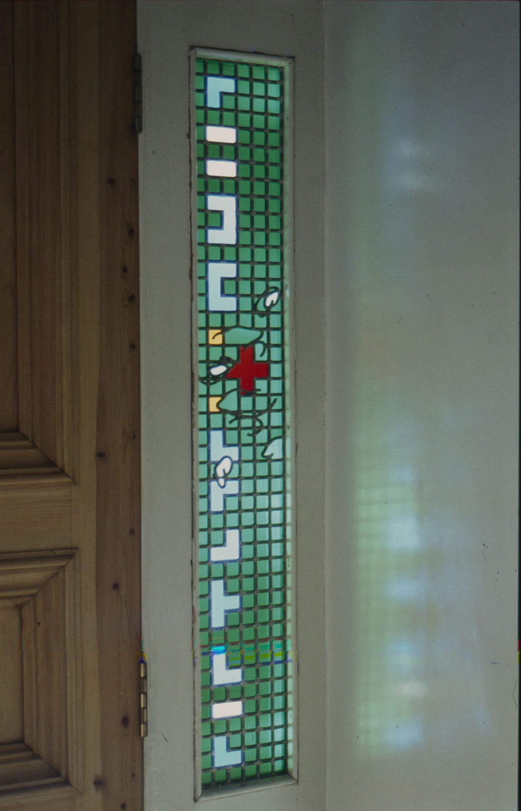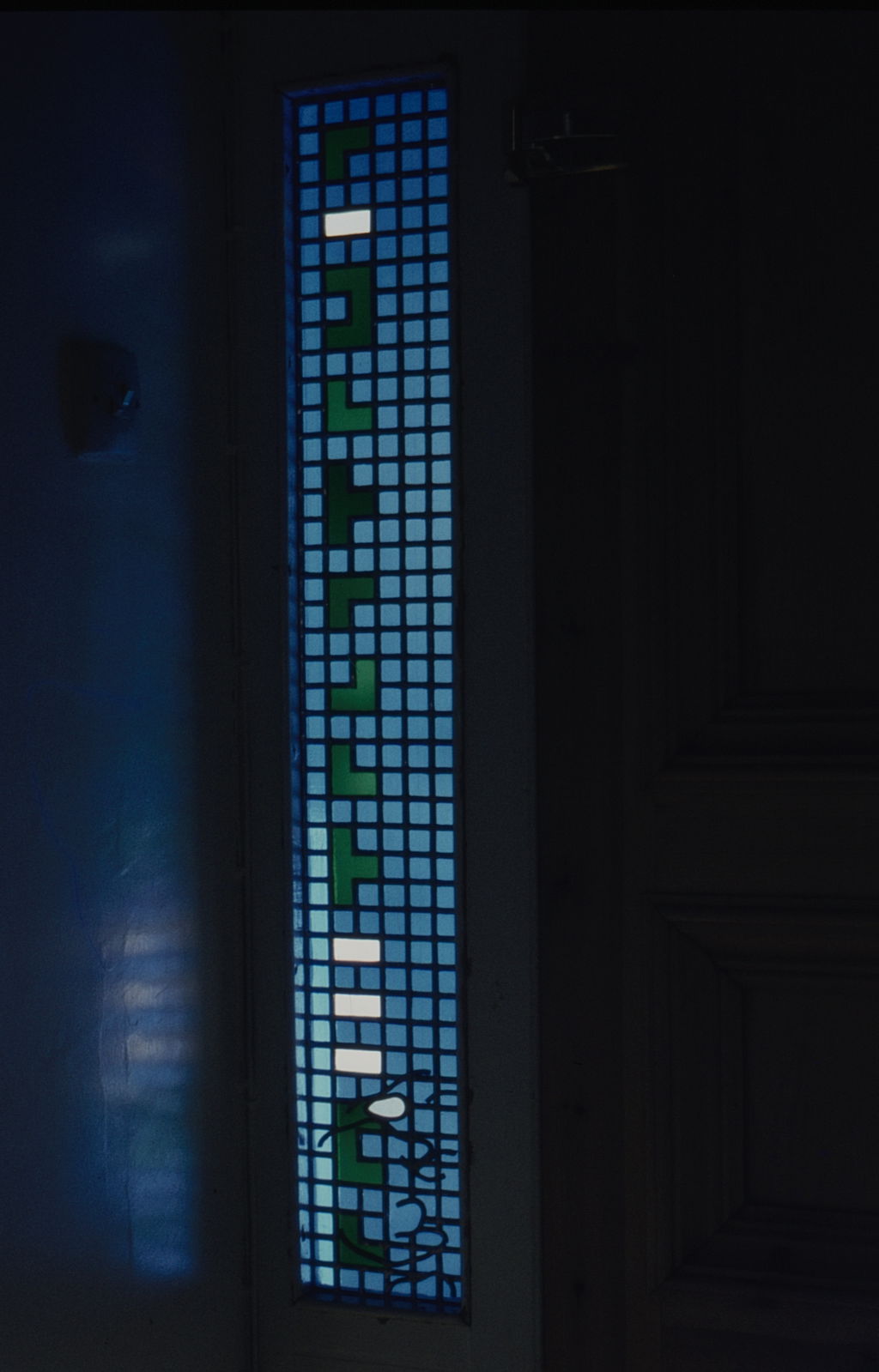 The work was later altered to accommodate expanded glass panels on both sides of the door and above it. The initial windows were incorporated into larger clear-glass compositions, where grid structures are disrupted by calligraphic lines. A rhomboidal glass detail was also integrated into the door.
