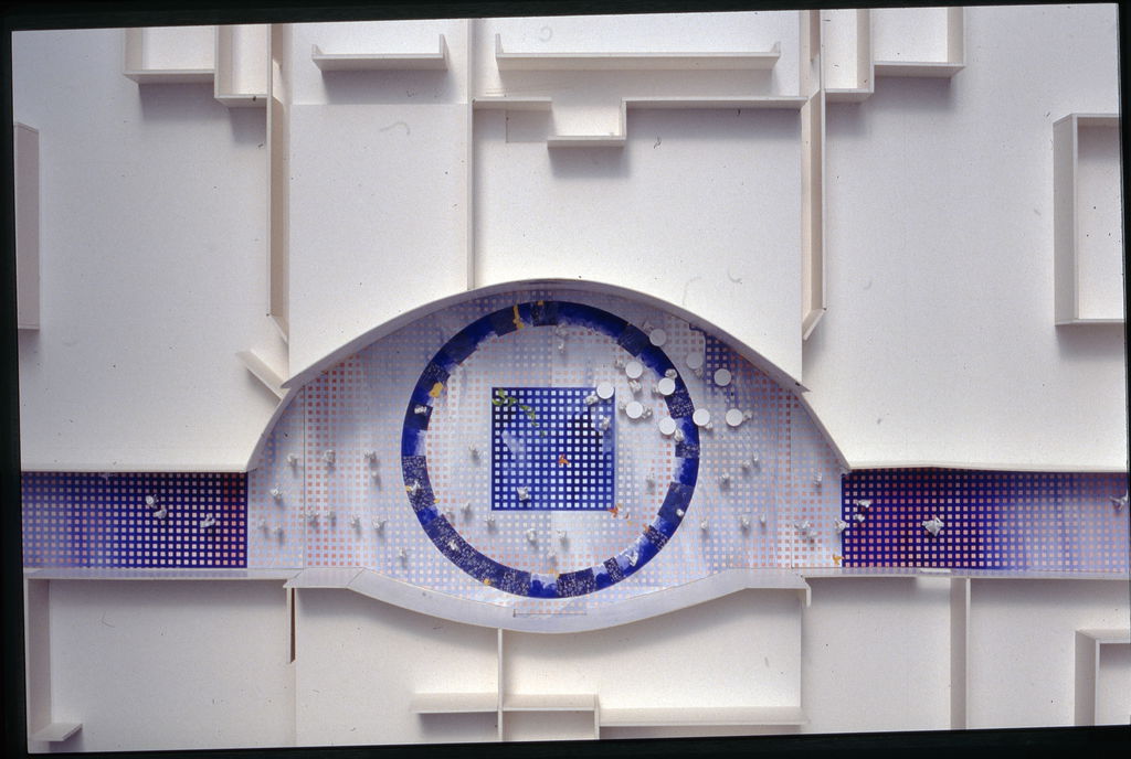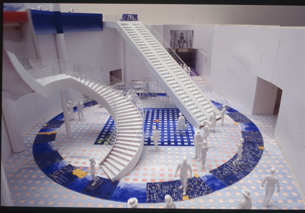Although Clarke's proposal remains unrealised, it survives through a model, designs on paper and sample mosaic panels. It included flooring featuring blue grid motifs, stained glass panels with amorphs for the central star-shaped skylight, blue mosaic-clad balustrades and stained glass windows above each entrance door.