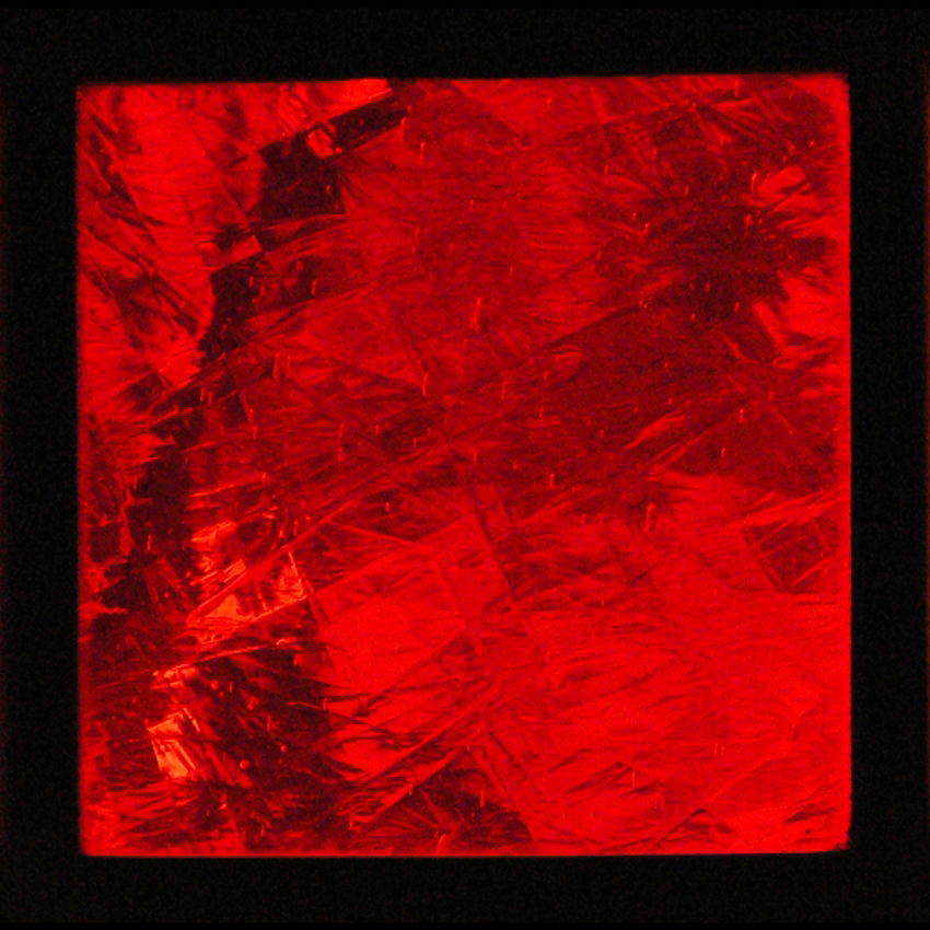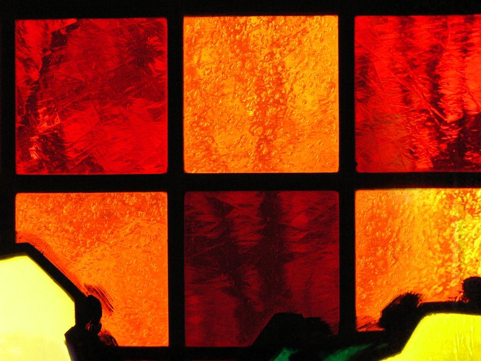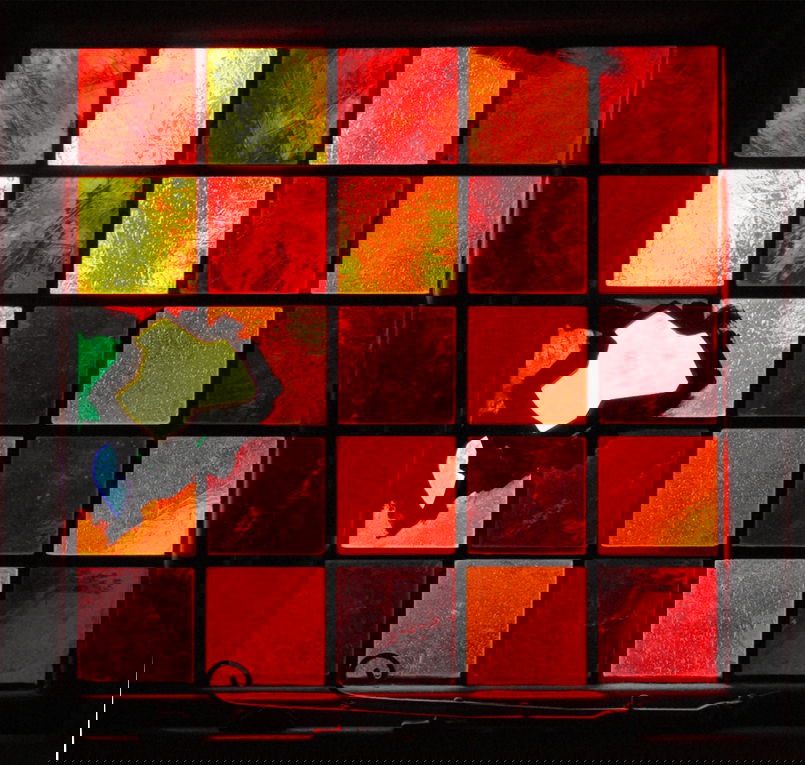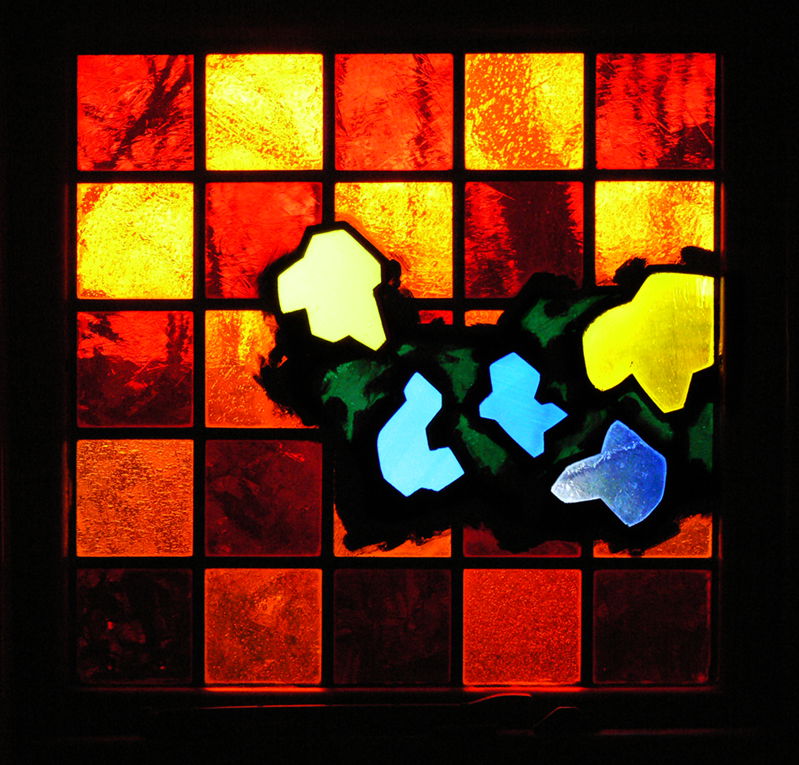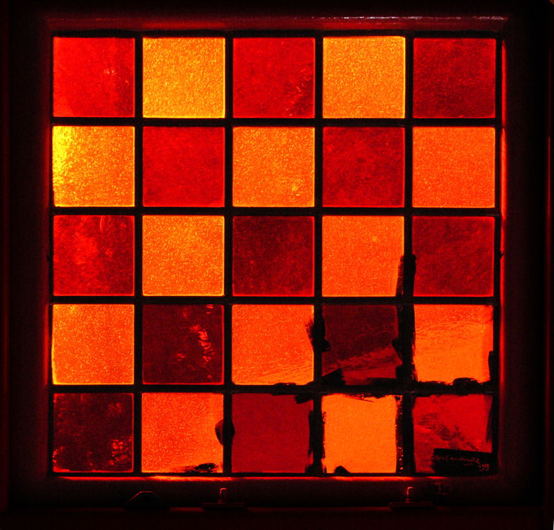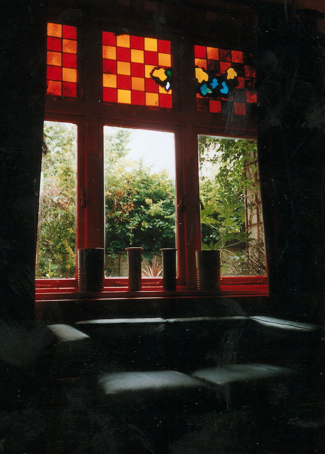The Red Room Windows consist of three stained glass panels set between wooden frames, created by Brian Clarke in 1989 for Peel Cottage. The panels feature a checkboard-like design in red and yellow, with colourful amorphs animating the central and right panels.