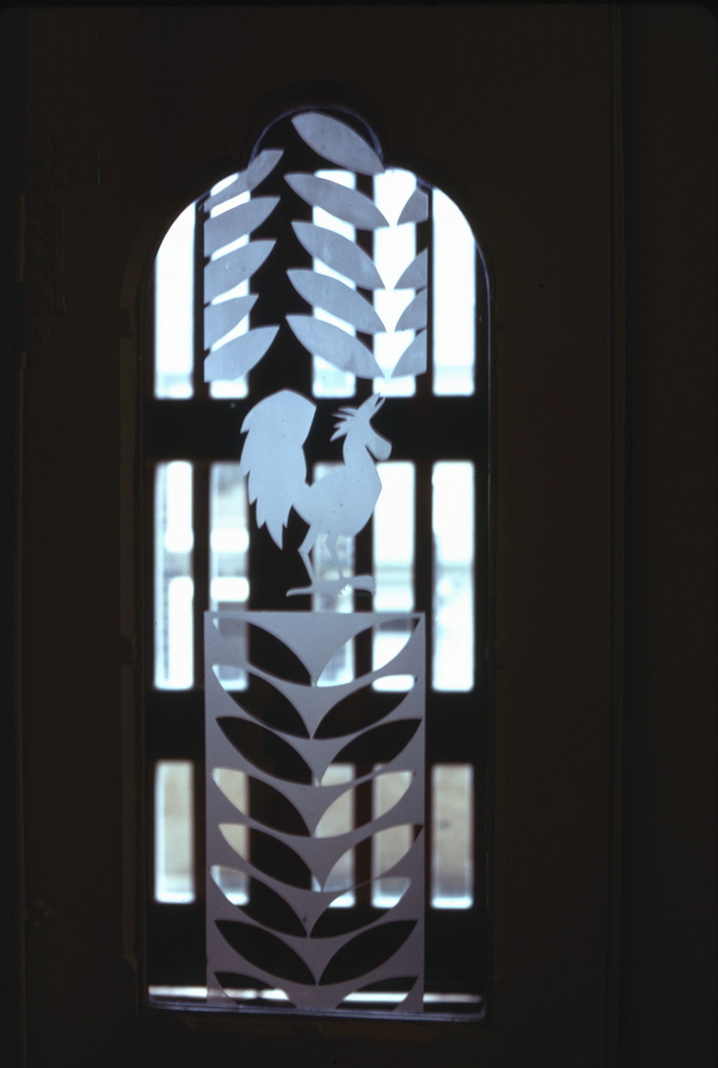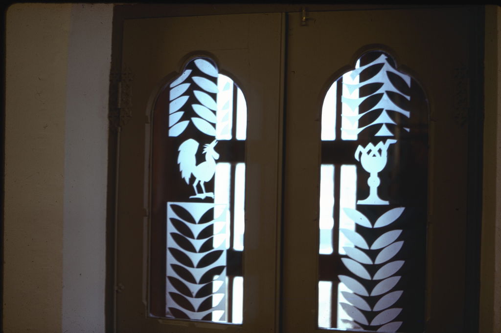 In addition to these, two further panels were etched in clear glass, featuring the symbols of a rooster and a chalice with a serpent. These refer to St. Peter and St. John the Evangelist respectively.