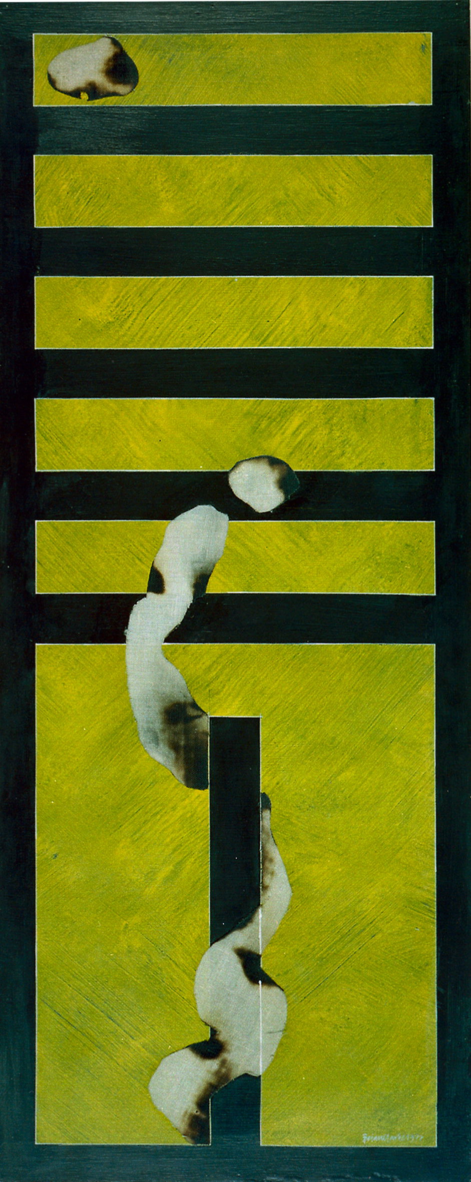 “The 'Brandcollage' or roughly translated, burnt collage (you may never have guessed) is a method of producing intricate and very subtle areas of activity in designs by burning under a gentil flame, small pieces of paper until they begin to discolour and transform their appearance. Schreiter, with great care uses the brittle fragments of burnt paper to constitute the areas of activity within some of his designs and gradually developed into papier collage these drawings form the basis for much of his work including glass design, paintings, and prints. [...] he produces whole compositions around these areas of activity contrasting passivity with movement and occasionally disturbing areas of quiet with sudden quotes from the brandcollage.”