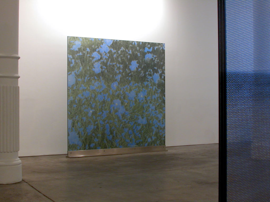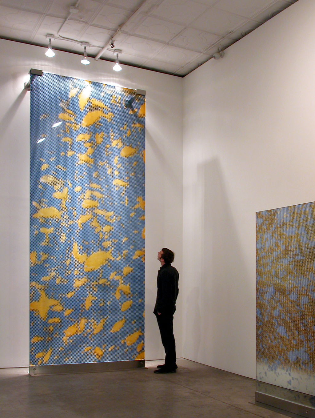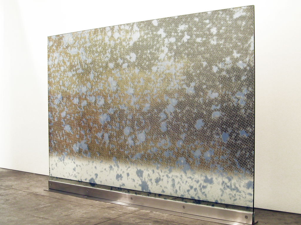 These works were created using the artist’s original technique of ceramic-glaze-printed float glass, first developed for the commissions of the Muhammad Ali Center and the Al-Faisaliah Center. The works consist of three layers of quarter-inch-thick float glass, with each layer printed with dot patterns in yellow, blue and black, respectively. The dots reference both digital printing technologies and the Ben Day dot technique, in which small, closely spaced coloured dots combine to form images that become fully legible only from a distance.