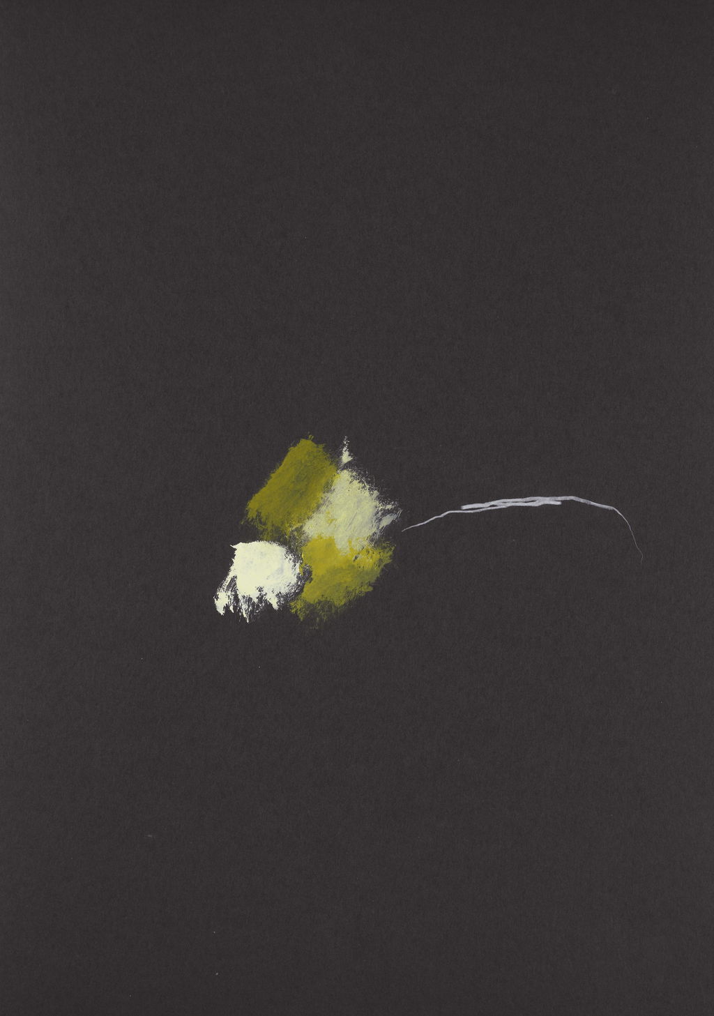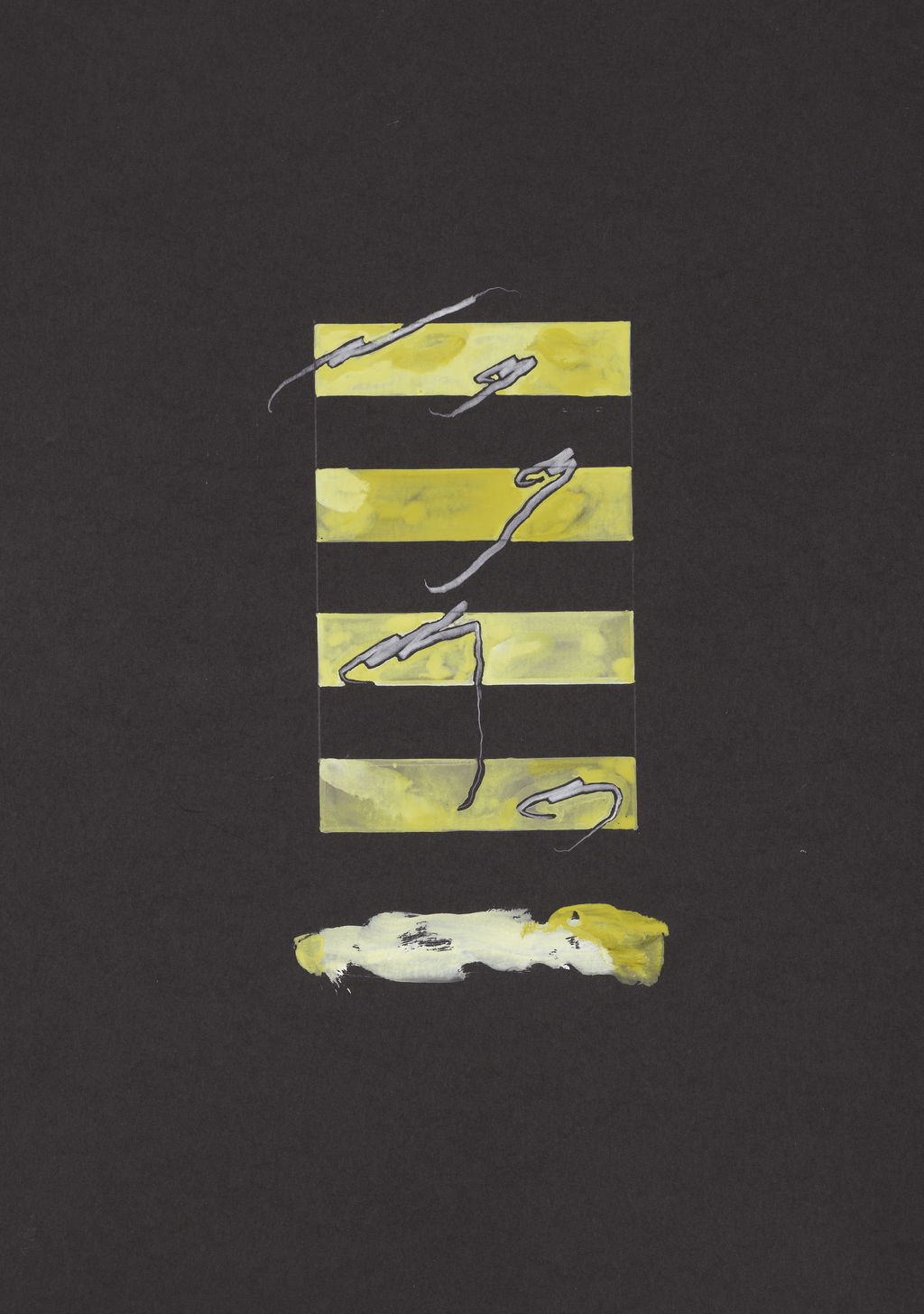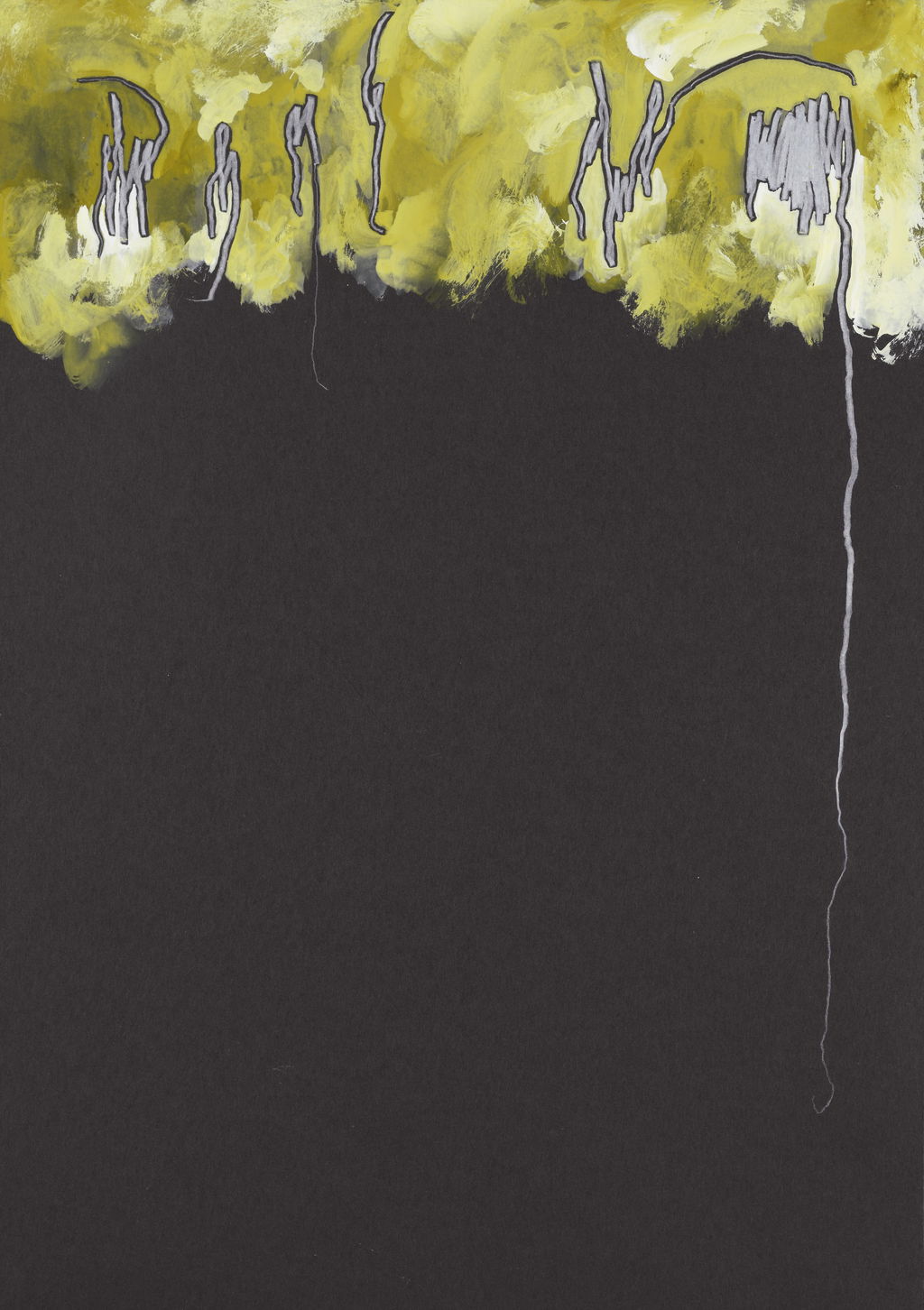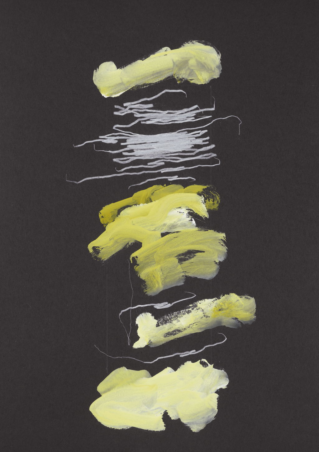 This Abstract Drawings series was created by Brian Clarke in 2011. Each work is executed on black card and explores variations of abstract shapes and colours. The compositions integrate various formal elements, including calligraphic lines, grid motifs, and formations reminiscent of clouds and flowers in yellow, ochre and white paint. Across the series, these elements appear in diverse configurations. They sometimes occupy the centre of the sheet and at other times are positioned along the borders or in the corners.